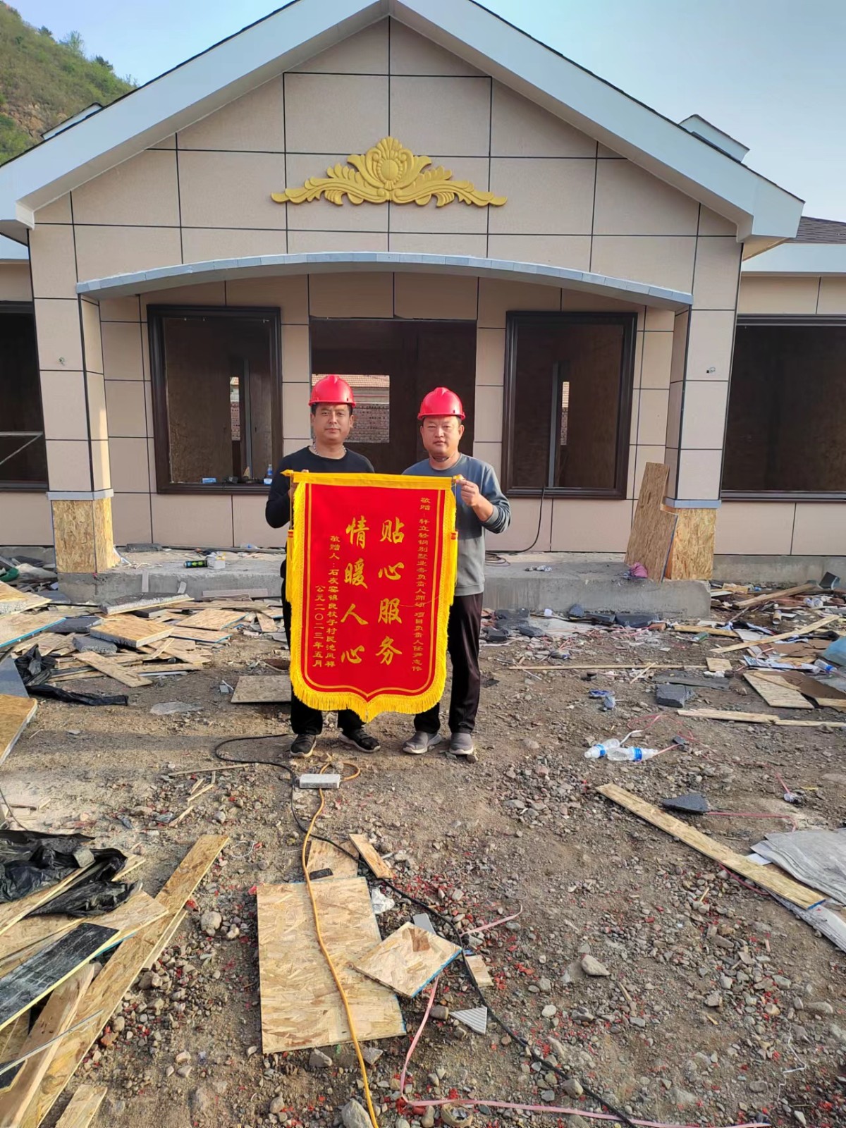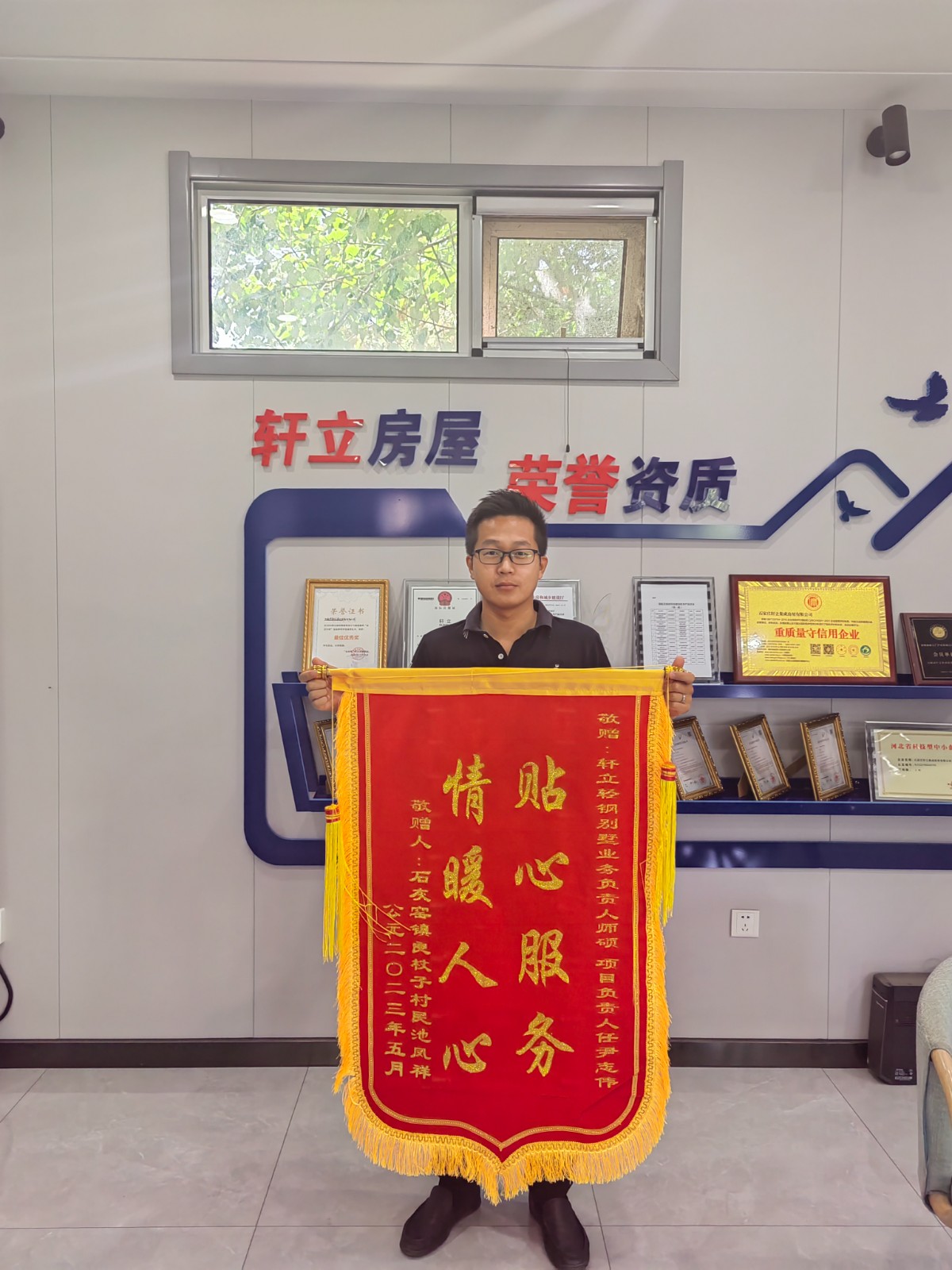 5月23號軒立業(yè)務(wù)經(jīng)理師碩及項目經(jīng)理尹志偉收到了來自承德市承德縣石灰窯鎮(zhèn)良杖子村業(yè)主池風(fēng)祥先生送來的致謝錦旗,業(yè)主家為一層117.1平方米的四室兩廳一衛(wèi)輕鋼別墅,目前主體已經(jīng)完工,窗戶及入戶門還未安裝,雖未見完工后的效果,業(yè)主池先生就已經(jīng)把錦旗送到項目部,由項目經(jīng)理將錦旗送回公司,池先生對項目經(jīng)理尹志偉的專業(yè)及業(yè)務(wù)經(jīng)理師碩的負(fù)責(zé)進(jìn)行了高度的贊揚(yáng)。