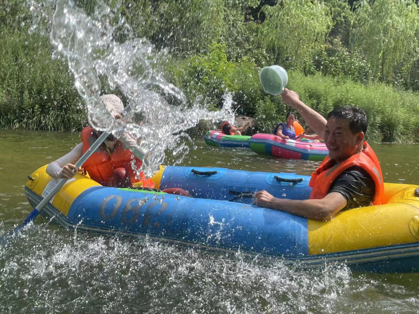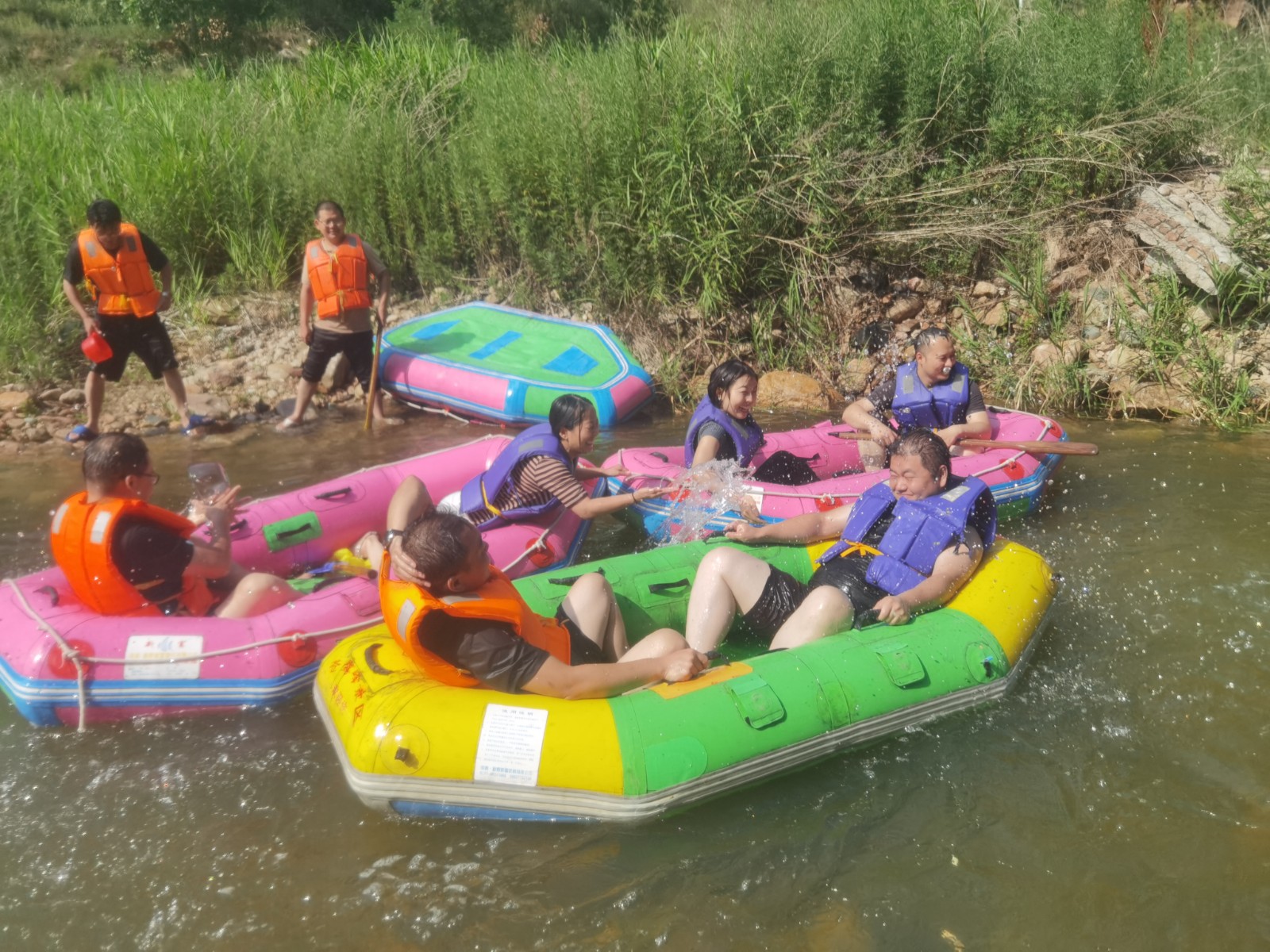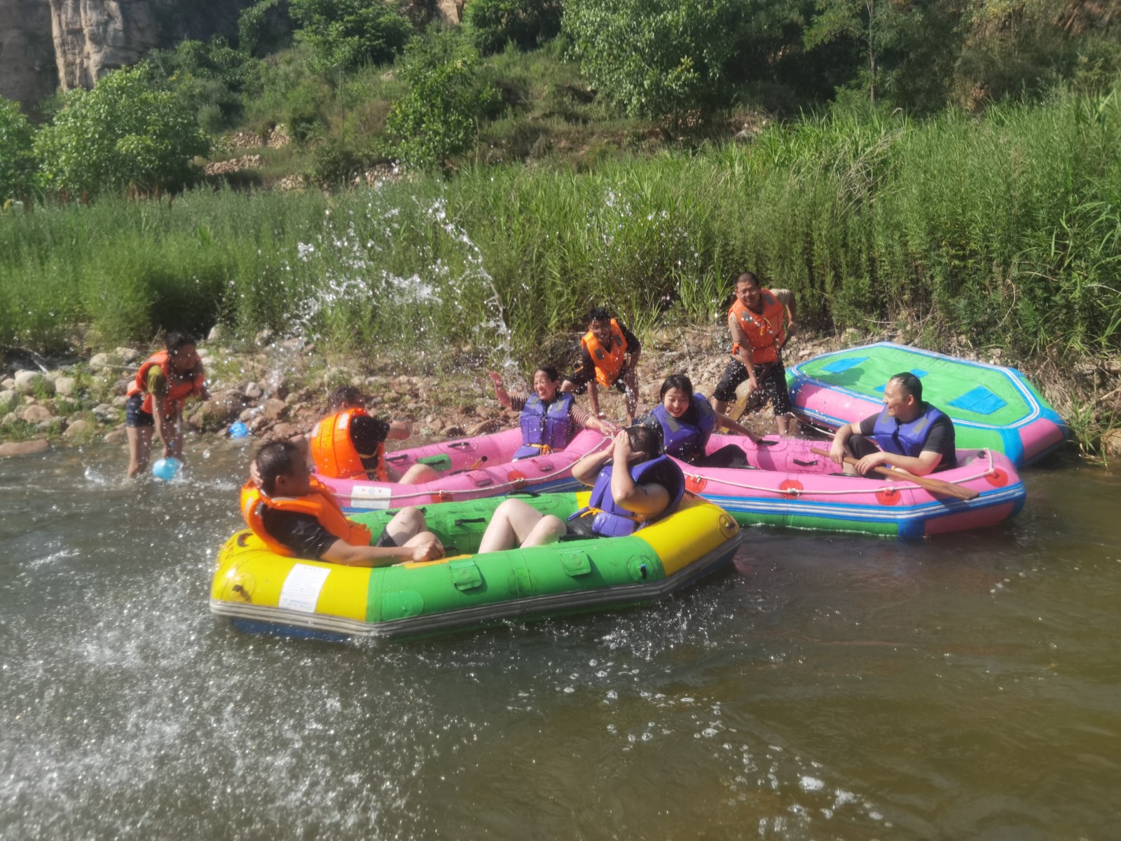 等來到流速不快的淺灘時,大家卸下緊張和疲憊,或躺或坐在船上,愜意地曬起了日光浴。還有的在河里打起了水仗,一時間水花翻飛,戰(zhàn)況激烈。清涼的河水刺激著每一個人的神經,尖叫聲、歡笑聲響徹整個河谷,盛夏的炎熱和身心的疲憊也在此刻煙消云散。