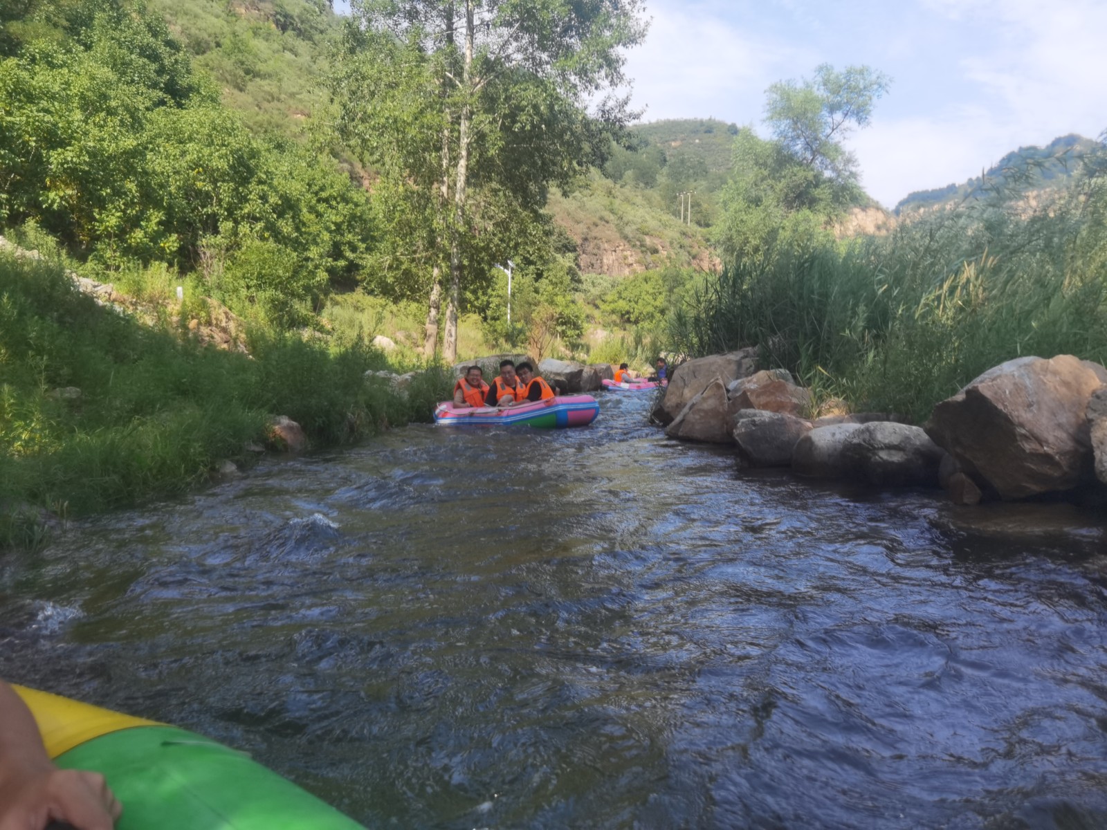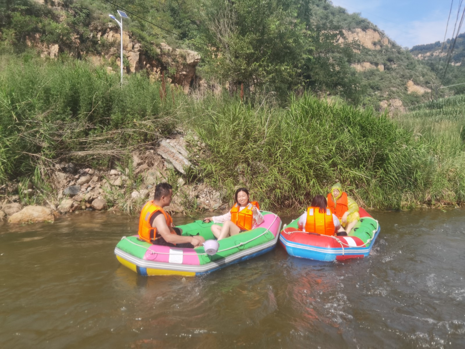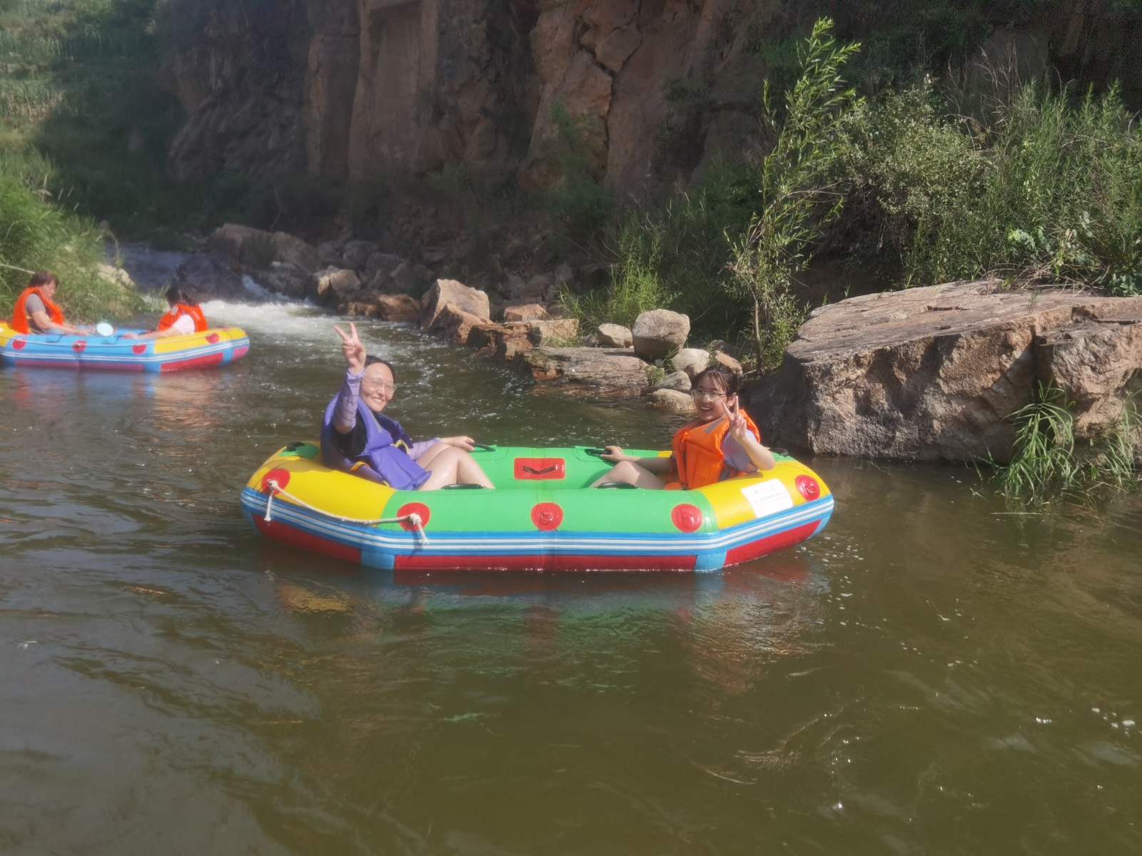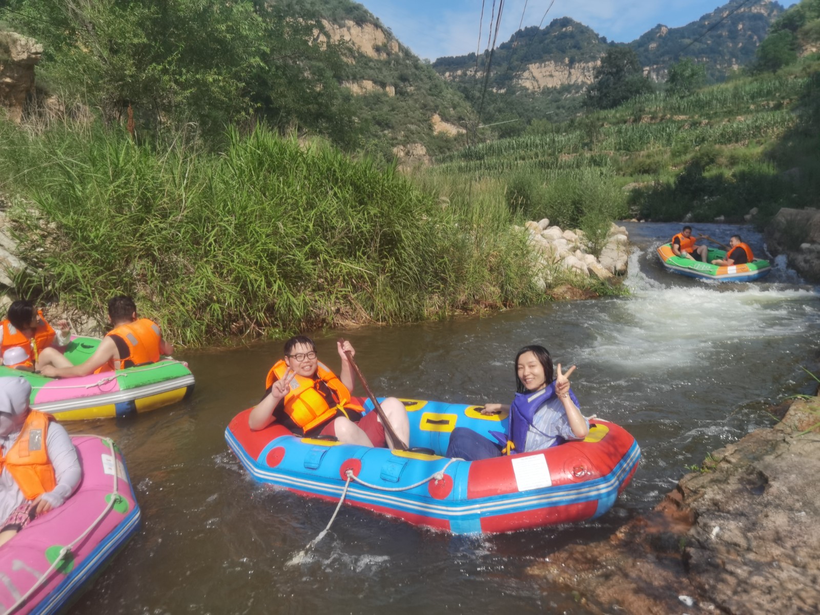 等來到流速不快的淺灘時,大家卸下緊張和疲憊,或躺或坐在船上,愜意地曬起了日光浴。還有的在河里打起了水仗,一時間水花翻飛,戰(zhàn)況激烈。清涼的河水刺激著每一個人的神經,尖叫聲、歡笑聲響徹整個河谷,盛夏的炎熱和身心的疲憊也在此刻煙消云散。