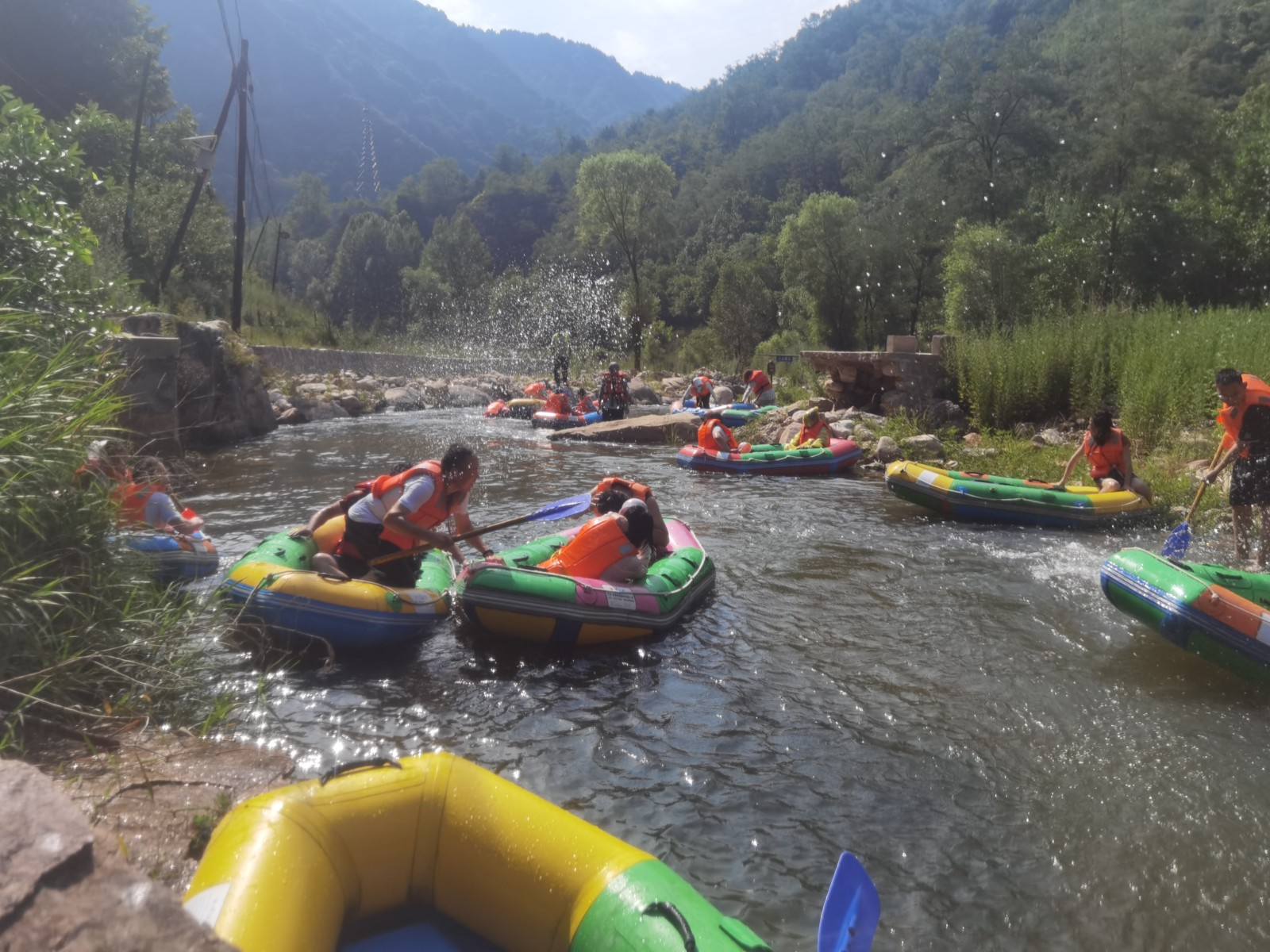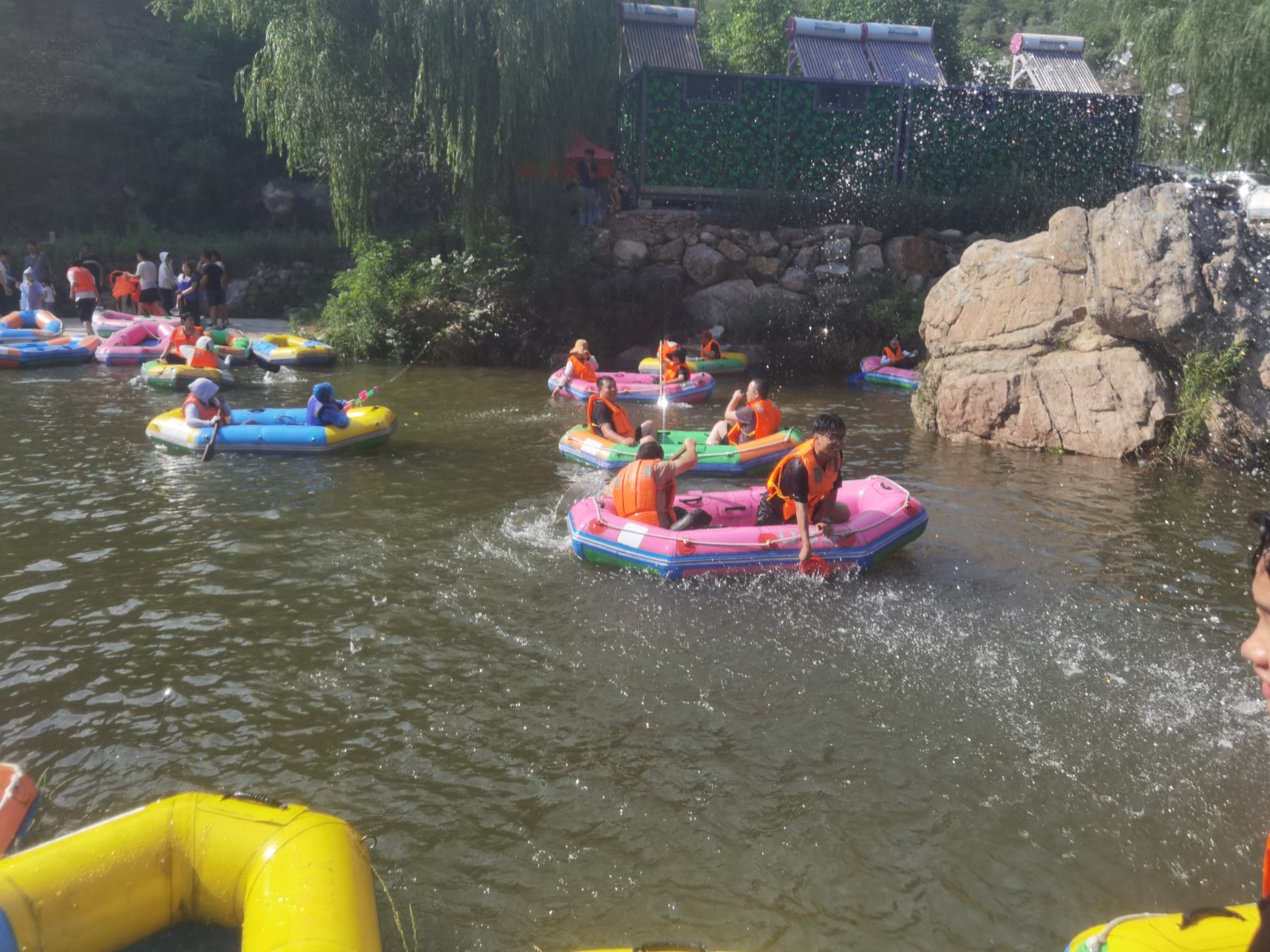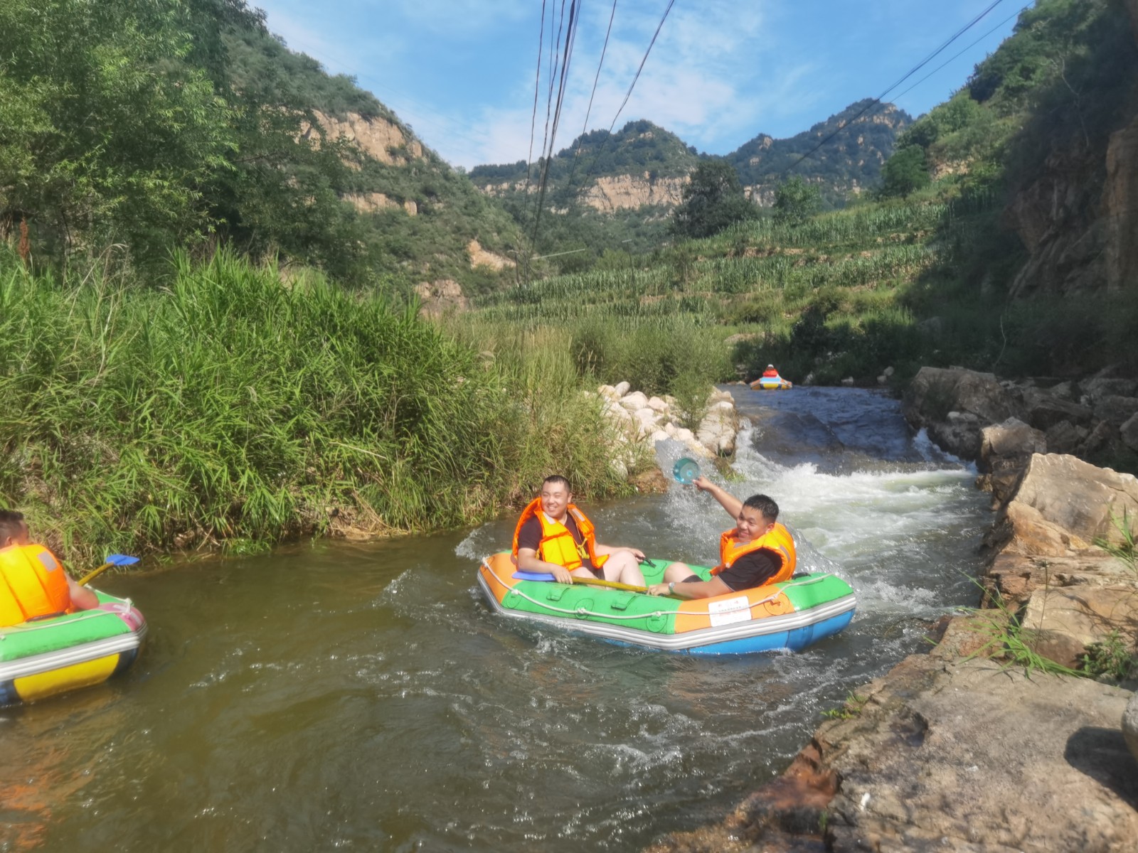 隨著工作人員將漂流筏推向出發(fā)高地,河中頓時水花四起,一聲接一聲尖叫和歡呼不絕于耳,剛出發(fā)就已是激情滿滿。