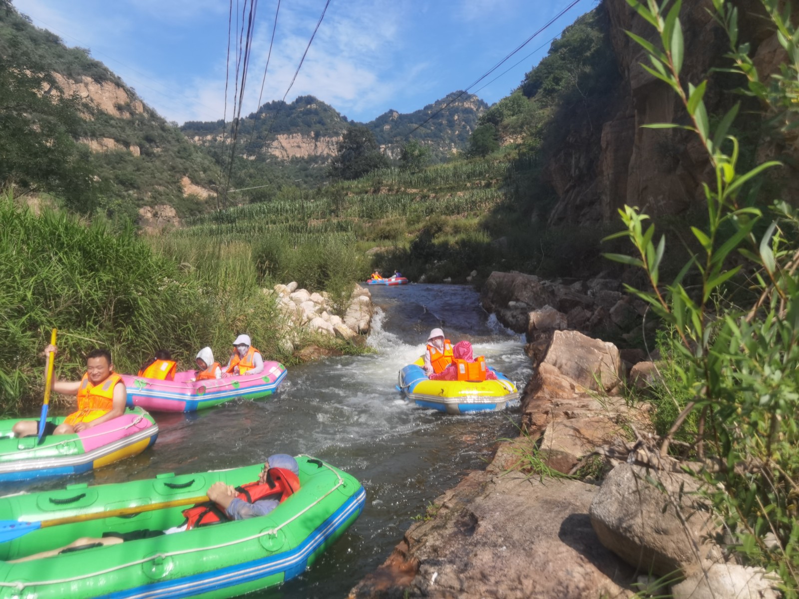 隨后大家來到農家院附近就餐,大家津津有味地品嘗著地道的農家菜肴,為下午緊張刺激的漂流活動補充能量。一番小憩過后,就直奔蒼鷺峰漂流景區(qū),大巴行駛在山間的小路上,沿途天朗氣清,碧空如洗,山巒聳翠,大家無不沉浸在這怡人的景色中,頓感心情舒暢。