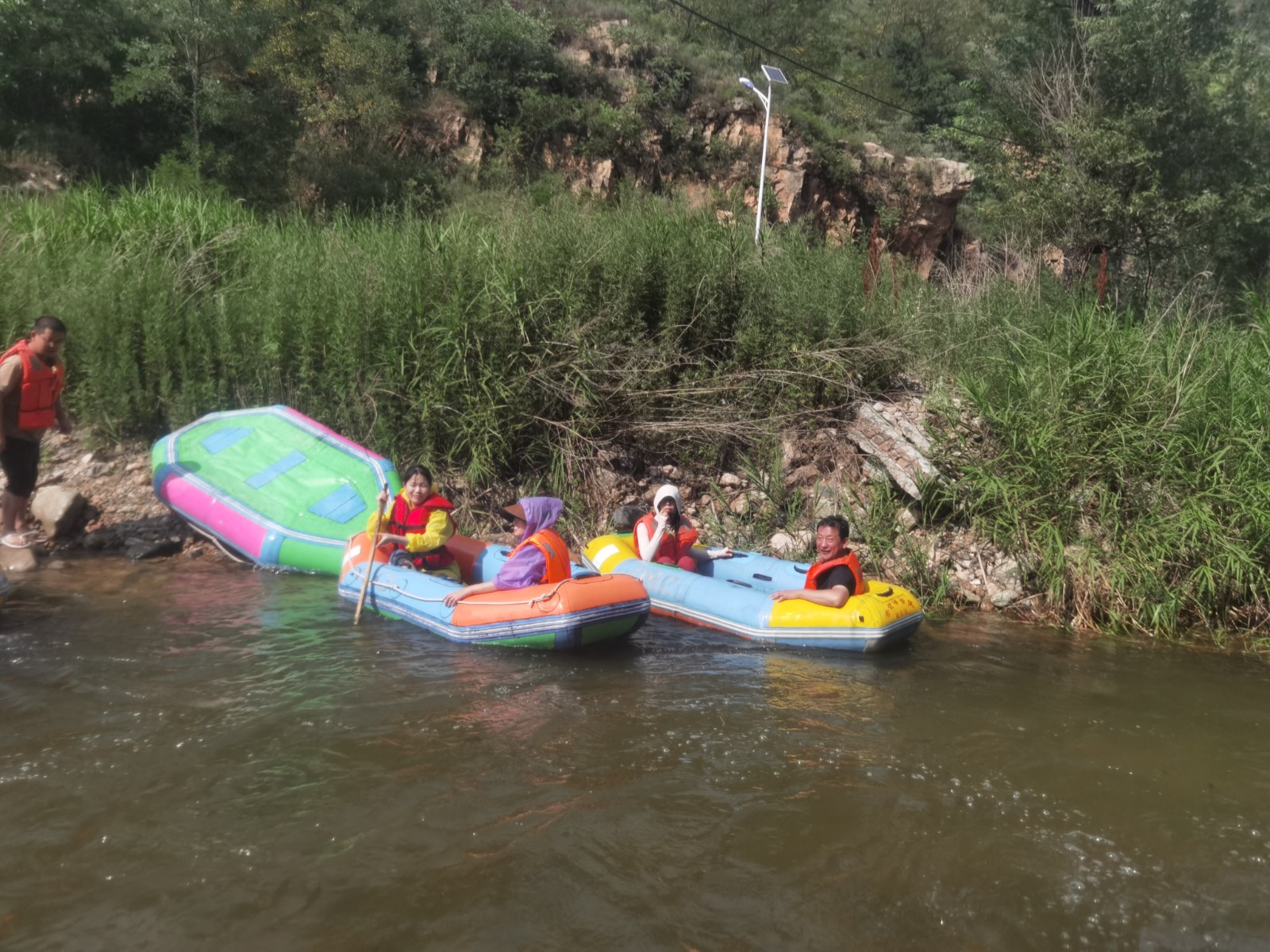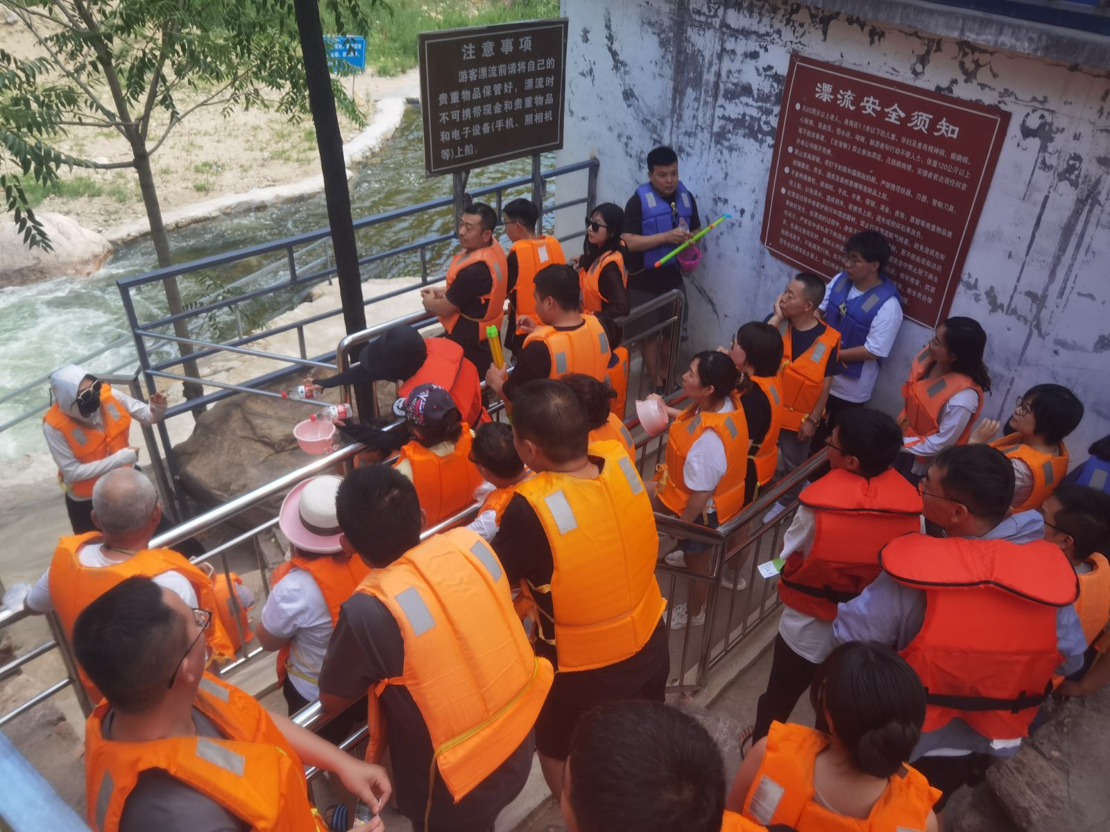 到達漂流區(qū)后,大家一個個摩拳擦掌、躍躍欲試,迫不及待想要體驗一番。迅速戴好安全帽與救生衣,兩人一組,全副武裝,排隊等待緊張刺激的漂流之旅。