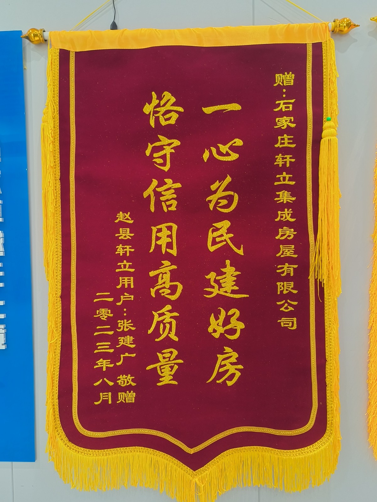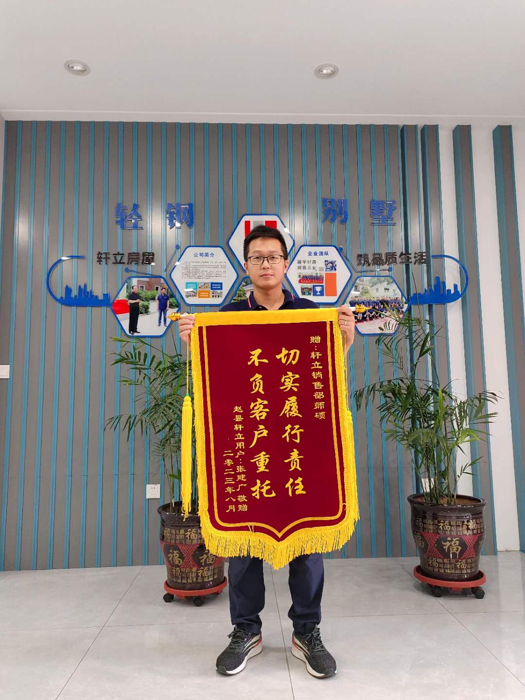 8月28日,對于軒立來說又是一個特殊的日子。今天,軒立收到了來自石家莊趙縣前大章鄉(xiāng)后大章村業(yè)主張建廣先生贈送的三面錦旗,給予“一心為民建好房,恪守信用高質(zhì)量”“工作忠于職守,做事認真負責(zé)”“切實履行責(zé)任,不負客戶重托”的高度評價,是對業(yè)務(wù)經(jīng)理師碩、項目經(jīng)理劉學(xué)良工作認真負責(zé)的高度贊揚,也是業(yè)主張先生對石家莊軒立集成房屋有限公司的匠心品質(zhì)的信任與肯定,以及對我們所有員工的一份認可與鼓勵。